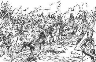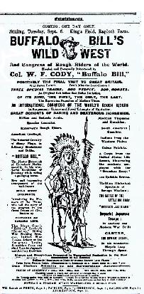 | A lot of additions and changes to the programme had taken place since 1891-92, but Wild West fans were not to be disappointed. The old familiar features - the Indian attacks on the Deadwood Stage, the wagon train, and a settler�s cabin - remained as integral parts of the entertainment. The image to the right shows how the infamous Custer battle of 1876 was represented in a newspaper advert for the show. |