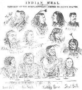 A line drawing of the proceedings at the Galloway dinner appeared in the Glasgow Evening News, 7th December 1891. It depicts several of the key figures with the Wild West show. Among them are John Shangrau and George C. Crager, captioned as �The Interpreters�. Also present are Lone Bull, No Neck, Kicking Bear (standing), and Short Bull. Click on the thumbnail to view the full-sized drawing.